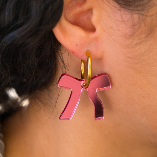 Pearlescent Beige Dangly Bow Hoop Earrings