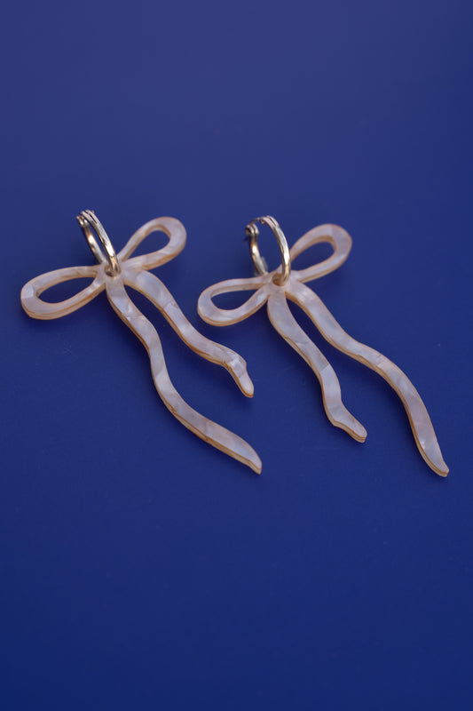 Pearlescent Beige Dangly Bow Hoop Earrings