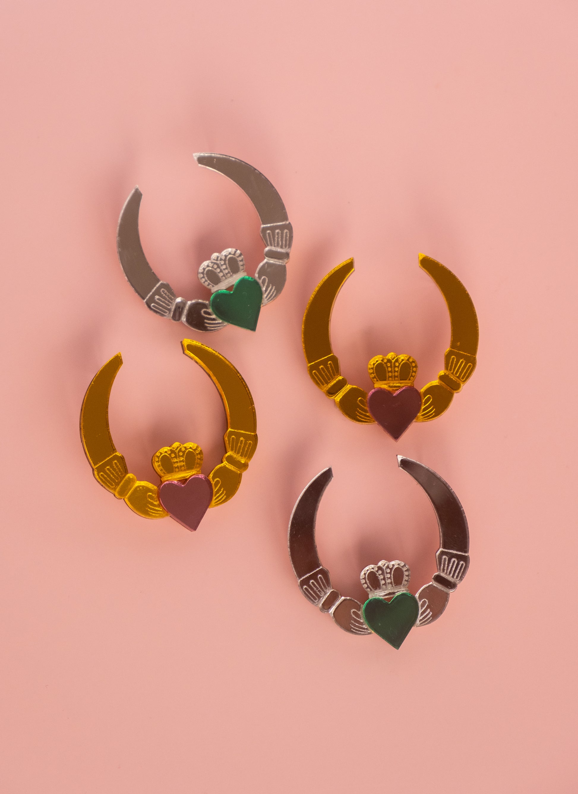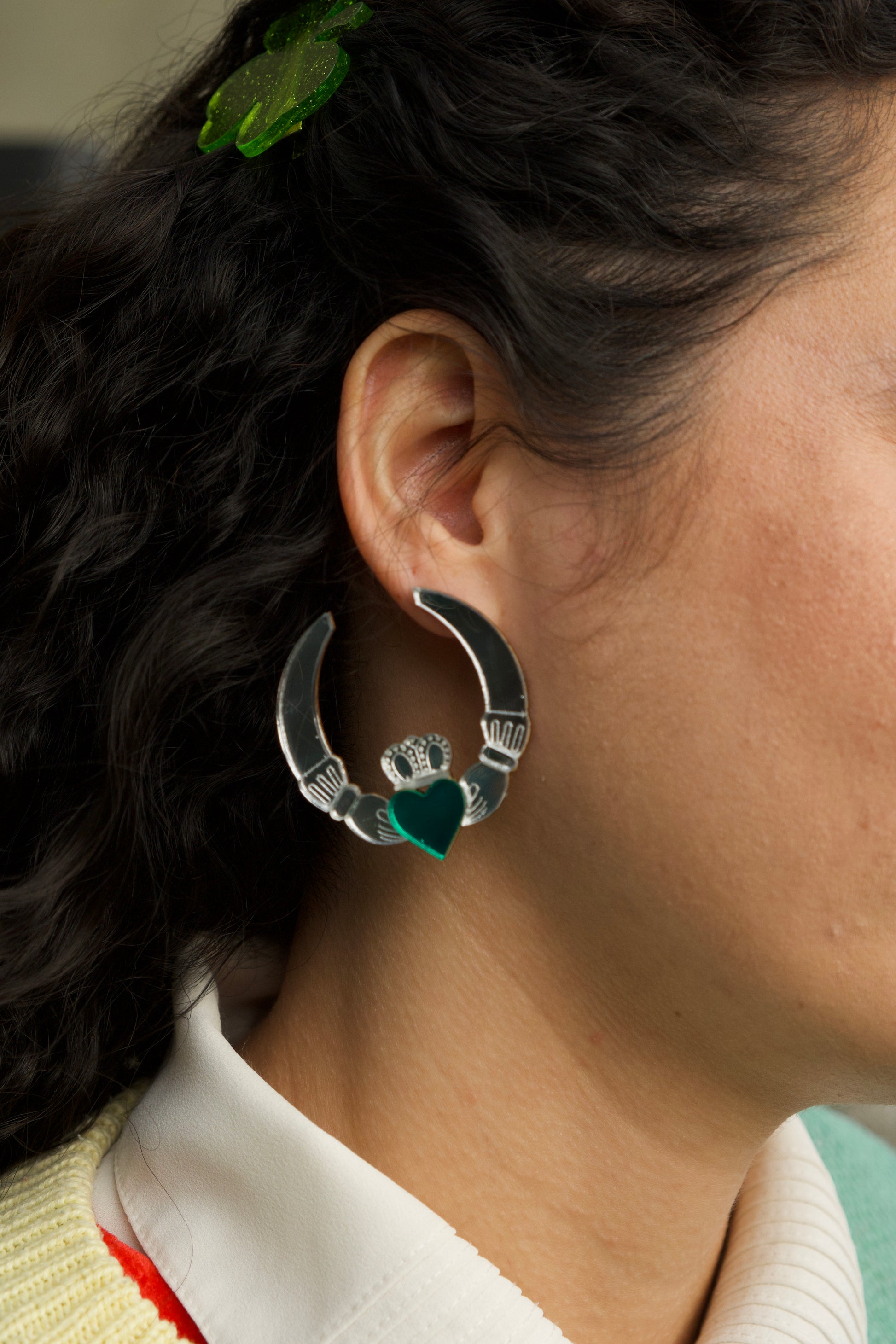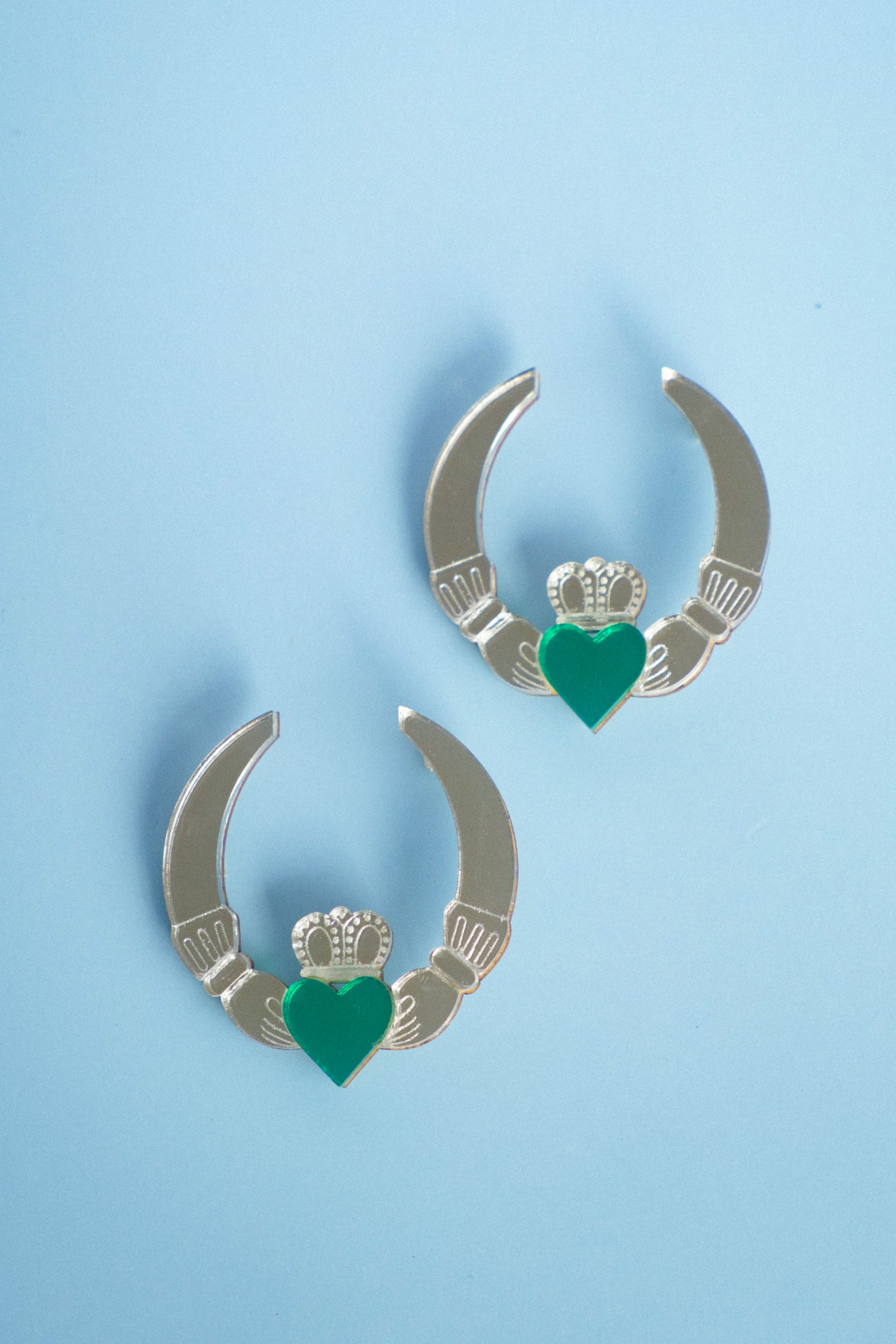 The Iconic Irish claddagh ring reimagined as stunning earrings. Traditionally, the heart represents love, the crown denotes loyalty and the hands are a sign of friendship.